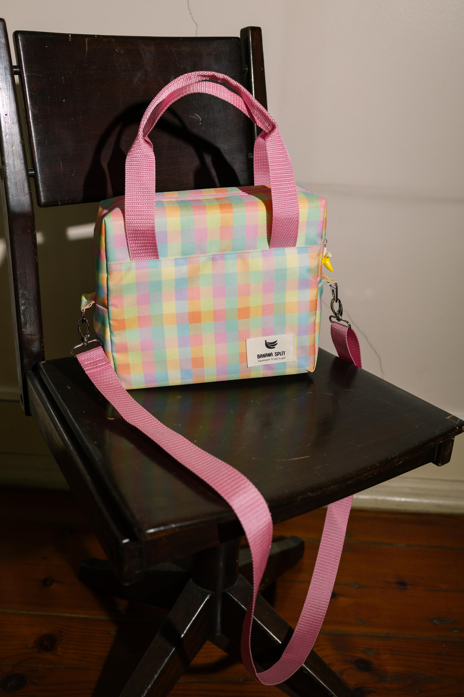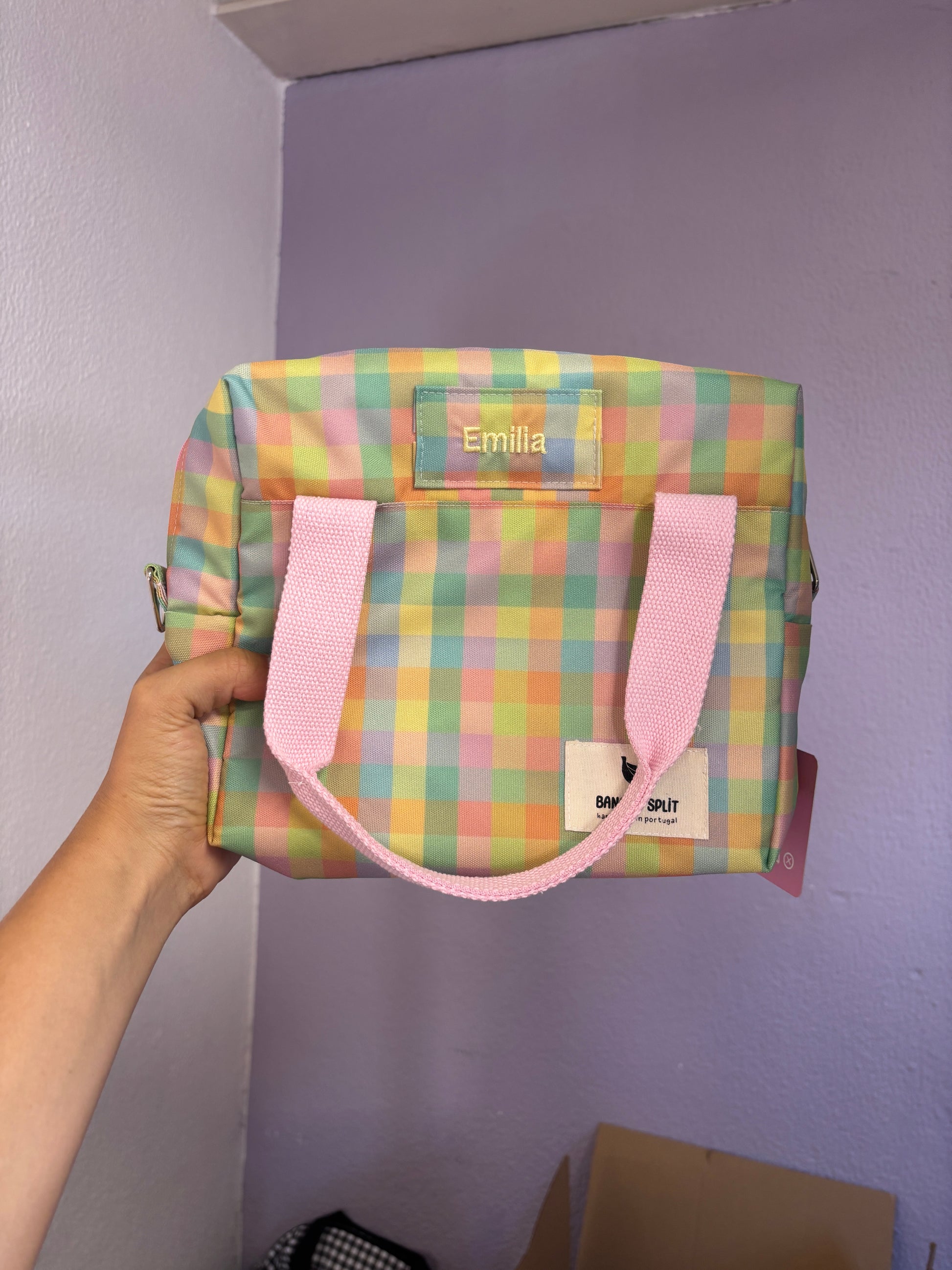 Tem duas alças curtas para transportar a lancheira na mão e uma alça ajustável para o ombro (removível).