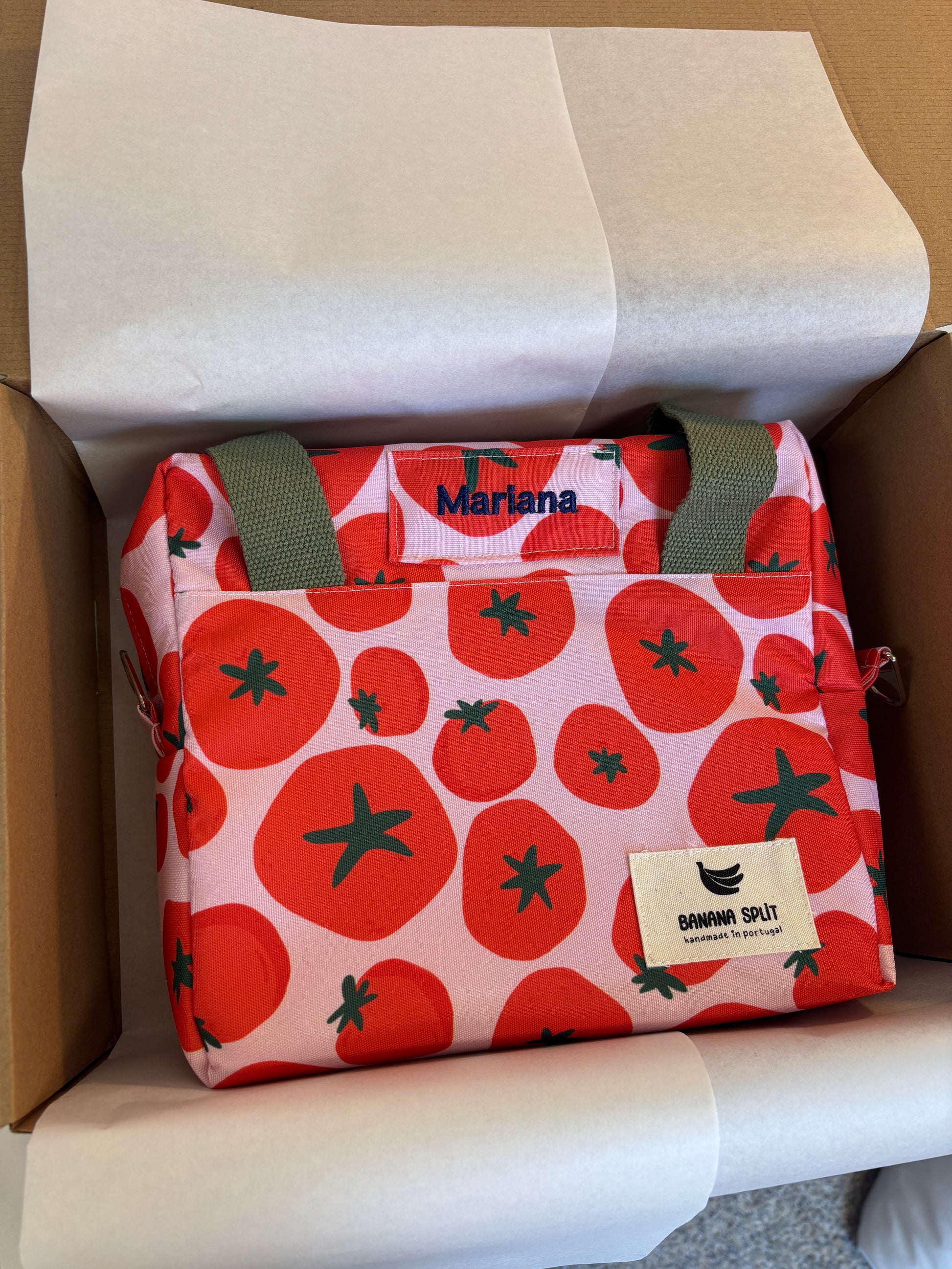 Tem duas alças curtas para transportar a lancheira na mão e uma alça ajustável para o ombro (removível).